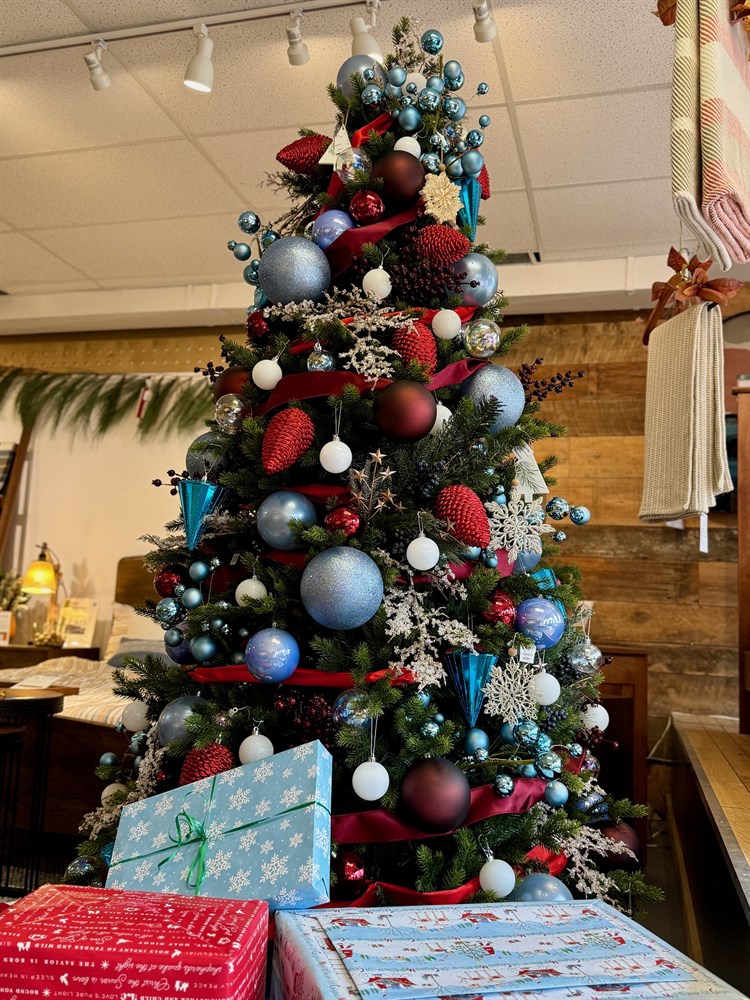 This tree celebrates America’s 250th year of independence with a patriotic palette of red, white, and blue. Adorned with Vickerman ornaments and military-themed decorations, the tree honors those who serve while creating a festive centerpiece for the season. The display is paired with our Winter Woodland scene, where military and other themed nutcrackers ride ski lifts, adding whimsy and storytelling to the design. Every element, from ornaments to accessories, showcases Vickerman products, blending tradition, patriotism, and playful holiday charm into a memorable tribute to the nation’s milestone anniversary.