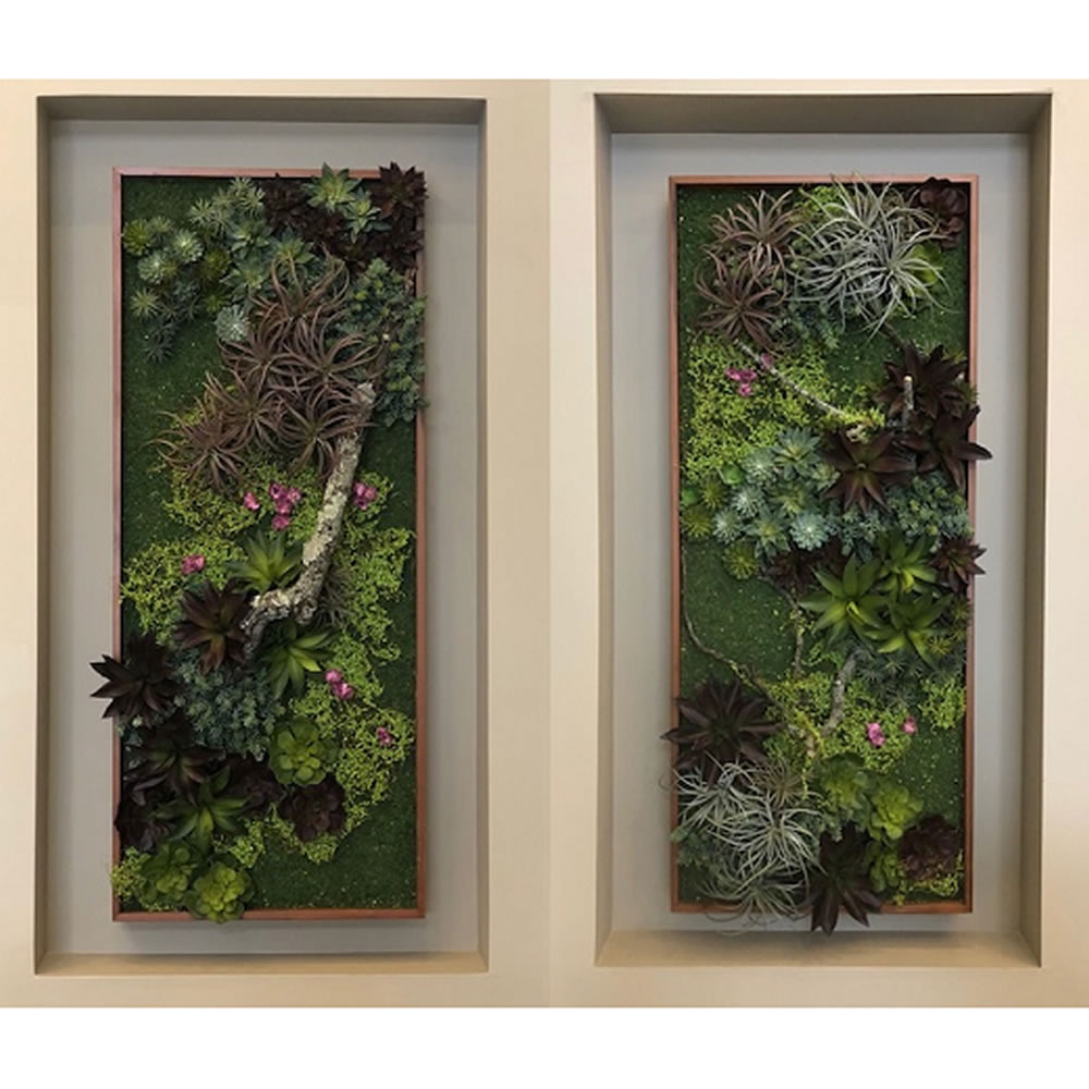 This planted creation is a beautiful piece of modern art that can bring life to any wall. Using Vickerman's succulent collection that has many different shapes, sizes and colors gives variation to the design that could be endless. Adding small pops of the color purple with floral elements helps break up the green and brings the eye around the whole design.
