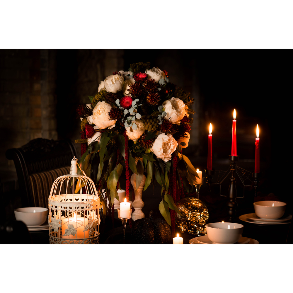Bring Halloween to the dinner table with these vampire like florals. Pairing Natural Botanicals with Vickerman's Everyday florals you can create a classy Halloween look for a spooky season.