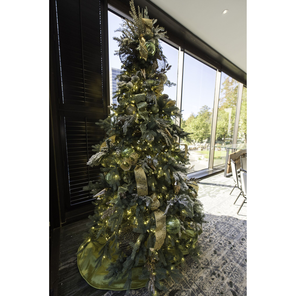 Showcased on this stunning Oregon Fur tree was unique ornamentation, sparkle succulents, and frosted elements to coordinate with the hotel’s existing color palette. Through the lobby, guests are greeted by three floor-to-ceiling windows and suspending, oversized ornaments and garland to create a hanging garden idea. The Landing introduced you to two 9-foot Blue Spruce trees with natural elements with hints of flocked sprays and metallic ornamentation. And upstairs each of the ballrooms featured two Flocked Alaskan Pine trees. Baker Design Group created a cohesive Christmas design to enhance the season for Omni guests and their employees.
