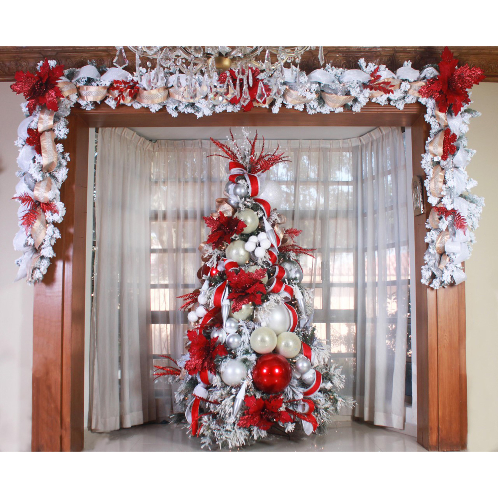 Red poinsettias combining them with spheres in light white, champagne, and silver tones to create the perfect combination between traditional and modern.