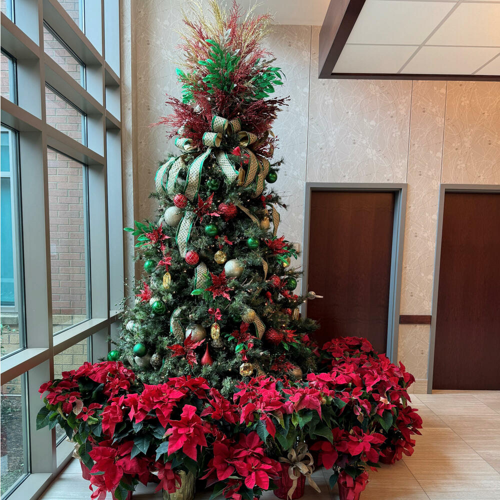 This tree features a beautiful but unique red, green and gold pallete with natural ornament elements, colorful sprays, and gorgeous two-tone ribbon bows.