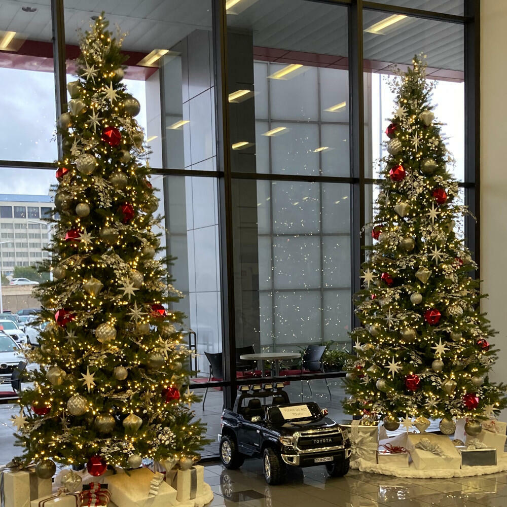 Original design and plans were to build two twin matching 12' trees, wreaths and garland. However, once we started the process, Covid-19 hit the country and we faced business shutdowns, product availability and massive shipping delays.Once we cleared these setbacks, we were able to complete this project of the original design. This is a 100% Vickerman products and materials. We have many more photos if needed.The main designer from our staff Jan L'Roy put the colors, theme and complete package together with the owner's vision for the location and concept they wanted to achieve. The client is Mike Calvert Toyota of Houston, Tx. The owner was so pleased with the final product and design they are looking for new locations to expand the Christmas program.We do want to thank Tommy Rivera and Doug Jacobs for an outstanding job in helping us to finally complete this project.