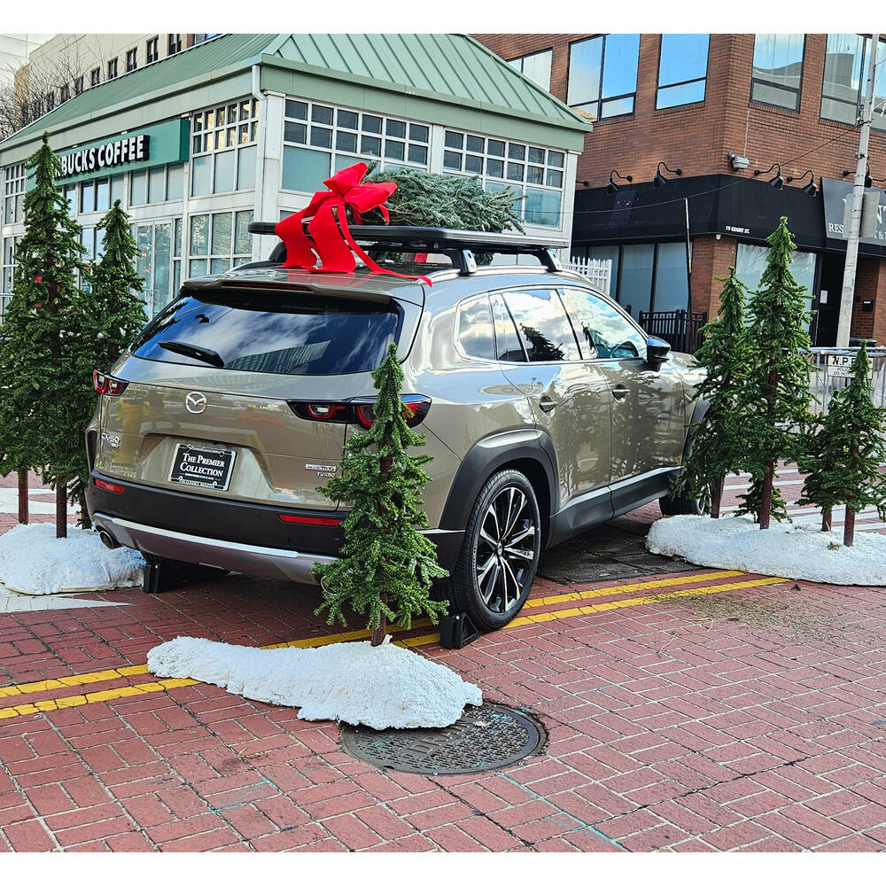 The Premier Collections Mazda dealership had a car on display at a local holiday market in White Plains NY. They came to me for a staging idea and this is what we developed! A Mazda, headed home, carrying a Christmas tree thru the woods. All of the Alpine trees were purchased from vickerman, specifically the PVC trunk ones.so I could use them outdoors. I then accented them with waterproof outdoor snowbank sculptures! And accented the tree on top with a red bow ?
