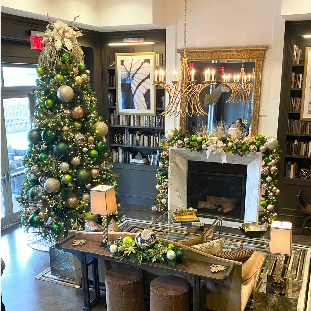 Our design in this high end residential condominium boasts a rich green. We needed a wow factor with the 12ft full tree from Vickerman, also the full garland helps us give a show stopper over the fire place. We use several different shades of green ormants to help make this tree and accents really pop. I've used several different orders from Vickerman to achieve this look!