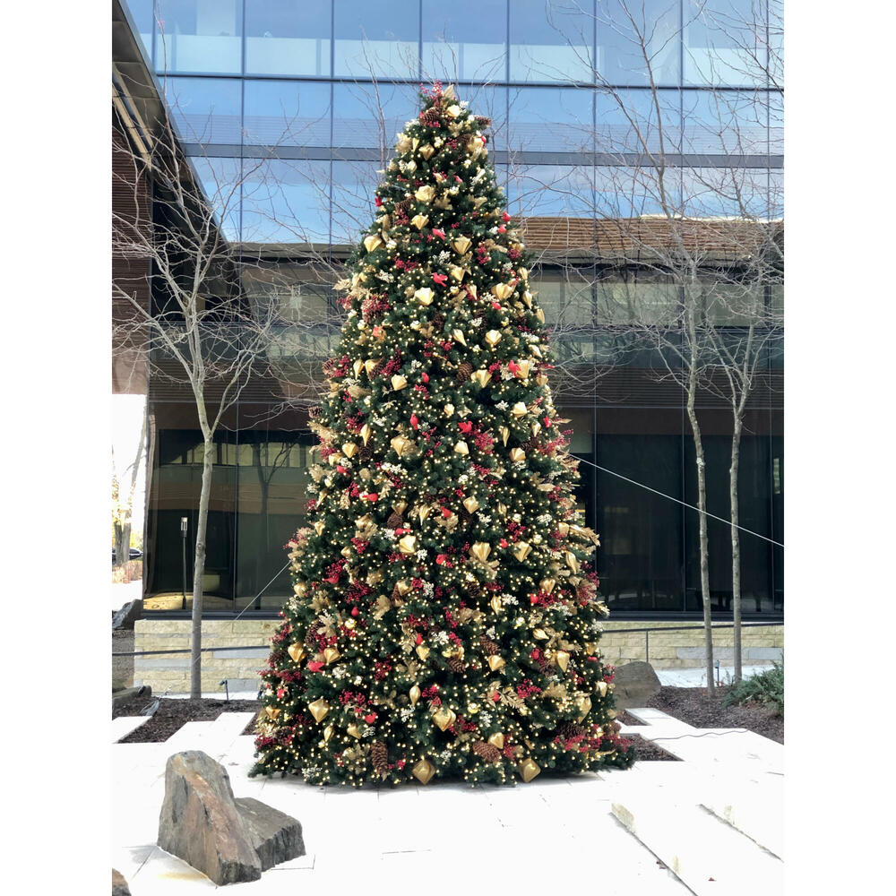 20' Decorated Grand Teton Outdoor Tree Installation. This tree is installed in the entrance courtyard of a corporate headquarters building in New Jersey. 2023 is the third season that we have used the tree and decor at this location. It has performed problem-free each year. The decor is theme is traditional with red and gold ornaments. Decorations include gold shiny balls, gold candy swirls, gold fern leaves and red Cardinal birds.