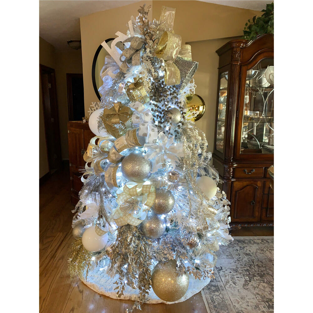 White velvet poinsettia picks and flocked ball ornaments adorn this tree, with jeweled and ball ornaments deepening the richness of layers.