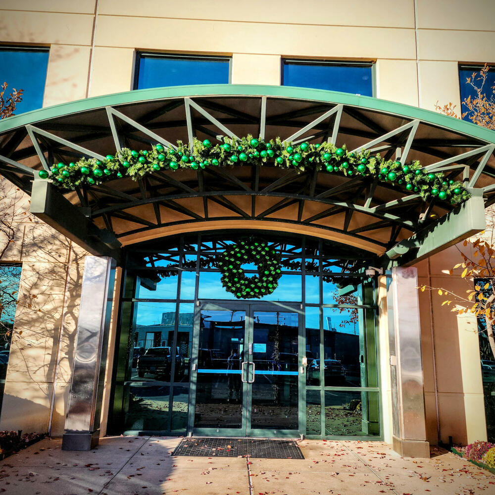 This modern design is for a Irish mechanical firm all in greens including an 18 foot Oregon Frame Tree with warm white lights.