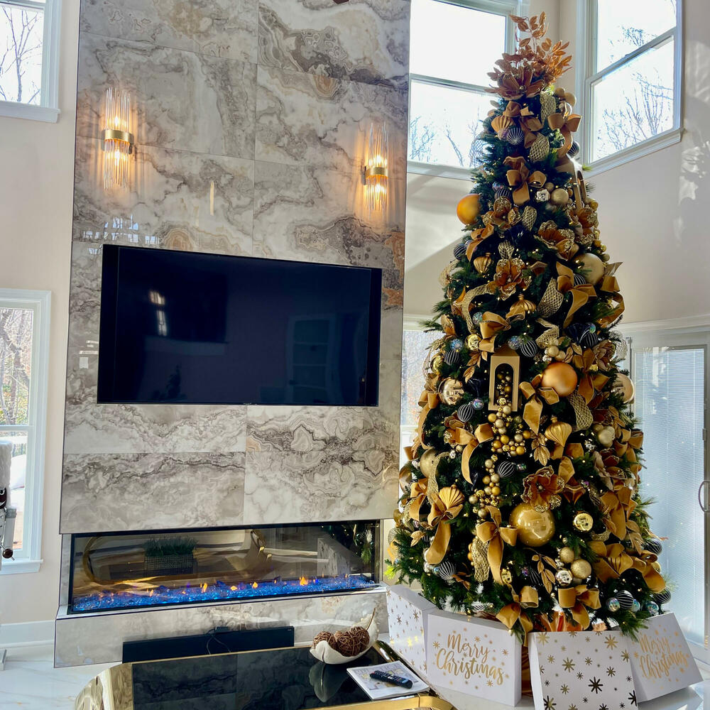 This beauty is from a client asking for a gold tree with touches of black. And Vickerman came through with the beautiful ornaments and ball garland throughout the tree! Vickerman for the win!