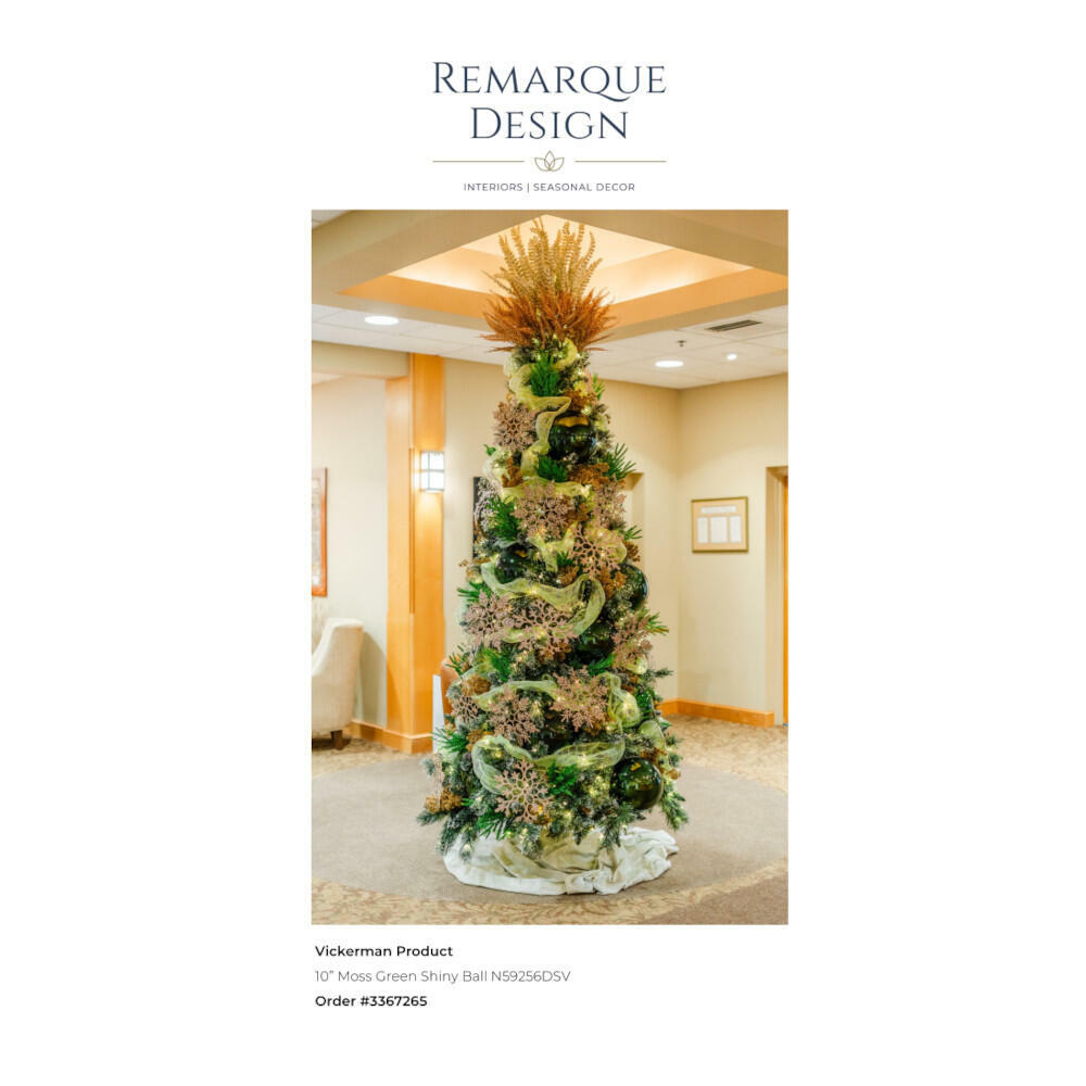 Multi-finish Vickerman 6" balls in moss green and multi-finish Vickerman 4" balls in copper form the rich palette of this dramatic musical instrument-themed tree. The glitter, matte and shiny finishes play off of each other beautifully, and give an overall effect of decadent elegance.
