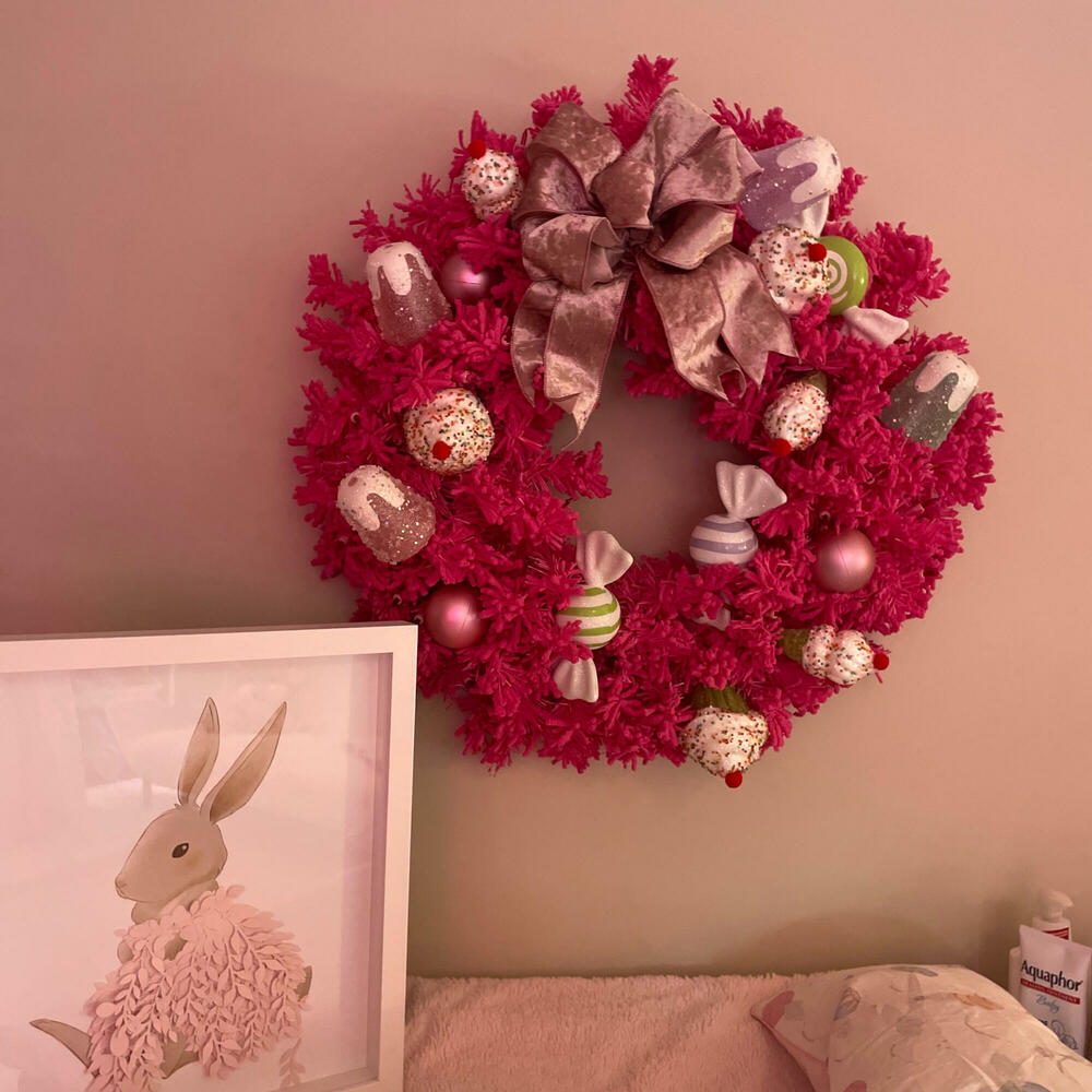 Candy themed decor with flocked pink wreath for the child's bedroom and playroom mantel.