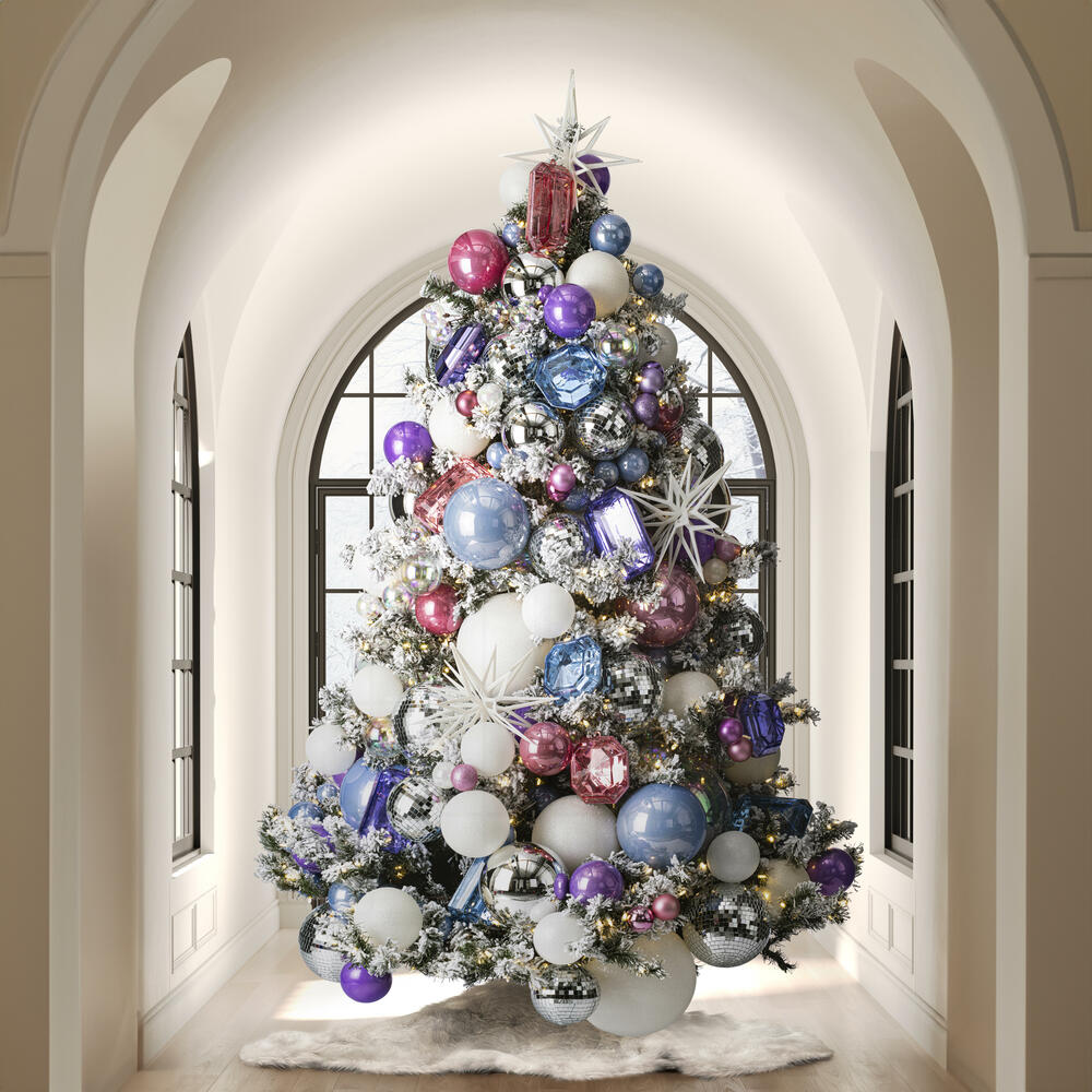 Bright Pinks and playful Lavender and Periwinkle. Iridescent and Silver balls. Shiny, Metallic, and Tinsel accents. Assorted Jewels.