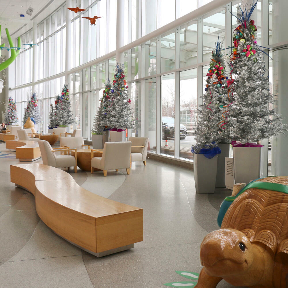 The interior design of Nationwide Children’s is everything a children’s hospital should be: bright, colorful, cheerful, and whimsical. It is a massive building with many large spaces and high ceilings. The first floor public area spans a length of over 1600 feet from the Emergency Department to an outpatient services building, and along the way links multiple other towers, smaller lobbies, and departments. For something of this scale, we needed a holiday display that was more than a large tree in one lobby. We designed and installed 248 trees in clusters of three to seven across the entire first floor, two lower-level cafeterias, and other key floors of the main building. Four dozen “tabletop” arrangements were created for dining tables and restaurant beverage stations, and six 18’ long garlands wrap faux “lampposts” in a main lobby lounge. Trees were placed near reception desks, and hallway corridors, close to visual focal points (like existing furniture, columns, or near entrances to offices) to maximize their visibility and impact. The goal is to walk down the entire length of the first floor hallway and always see a holiday display. Following the design precepts of “Ageless and Timeless, appealing to the Child in All,” the former holiday decorations were reimaged to a more inclusive “Winter Wonderland” theme offering bursts of color and whimsey to offset the grey Columbus winter weather. The winter wonderland holiday decorations are intended to be reflective of the flora and fauna that appear in the environmental graphics. They are not specific to any religion or celebration other than bringing some color into the Hospital during a festive time of year. There is an emphasis on the of Nationwide Children’s Hospital’s corporate colors and some donor relations requests. To reflect the whimsey and color of the interior design features, we swapped out old, discolored white trees for Vickerman's metallic silver trees, and used Vickerman's ornaments and décor in shades of hot pink, dark blue, turquoise, orange, purple, and bright green. The previous design had included only pink, blue, and green, so the incorporation of additional colors was a refreshing change. Selecting silver trees is non-traditional, but their metallic nature makes them sparkle and shine as sunlight comes through the hospital windows. The “toppers” of the trees are composed of glittery picks from Vickerman's that twist, twirl, bob, and feather in an explosion of color and texture. We also love incorporating what we call “Dr. Seuss” trees and we utilize them into several groupings: these 3’-5’ tall, intentionally bent and curved, metallic trees from Vickerman's further adding to the element of playfulness. Nationwide Children’s incorporates butterflies into their logo and branding, so we also made sure to use butterfly ornaments and décor on the trees, creating a “scavenger hunt” effect for visitors and staff who seem to delight in “finding” a butterfly tucked into the holiday decorations. Each year, we review the trees to determine which one need to be "refreshed", ensuring that the design and decor are always looking the best in can. Because the spaces are so large and the budget did not allow for hundreds of 12’ and 15’ trees, we created a way to artificially raise the trees by staging them in tall, silvery-grey containers. Using small, medium, and large containers from Architectural Supplements, we created groupings of small (3-4’), medium (7.5’), and large trees (9’-12’), to strategically create height and fill the larger spaces. Raising the trees up and off the ground was also helpful to the client, as they were concerned about children grabbing or pulling at the trees. To ensure that the trees cannot be pushed or knocked over in their raised containers, we weigh the containers with concrete bricks and secure the trees with custom plywood bases. We manage costs by incorporating varying quantities of décor on the trees—the smallest trees have little to no décor, and the medium and large trees might have décor throughout the whole tree or just on top. The differing levels of décor also help to add visual interest to the tree clusters. Installing this project is a huge undertaking, occurring in the “off hours” on a Saturday morning when the hospital is quiet. Every tree and container pairing is labeled with where it is installed, using nomenclature specific to the hospital. Those wooden wayfinding animals come in handy in identifying where trees are placed—descriptions like “Trio by Duck next to reception desk” are not uncommon. A portion of our team meets at the hospital to receive trucks of trees and containers, while another group stays behind and loads empty trucks. A third team comes through as the trees are placed in their locations and fluffs, straightens, tweaks, checks and fixes lights when needed, and performs any other cosmetic repairs. Install requires our entire staff—even our horticultural technicians and some exterior landscapers join us for the day. After many years of dialing inrefining our process we can now complete the install by late afternoon. Like many reoccurring client projects, this one has evolved over the years, and the current iteration is by far the largest, but also the most closely related to the vision of wonder and whimsy that makes NCH Nationwide Children’s such a special place. Every year, we delight in the response we get from doctors, nurses, patients, and visitors as we set the trees in place and fill the hospital with color and joy.