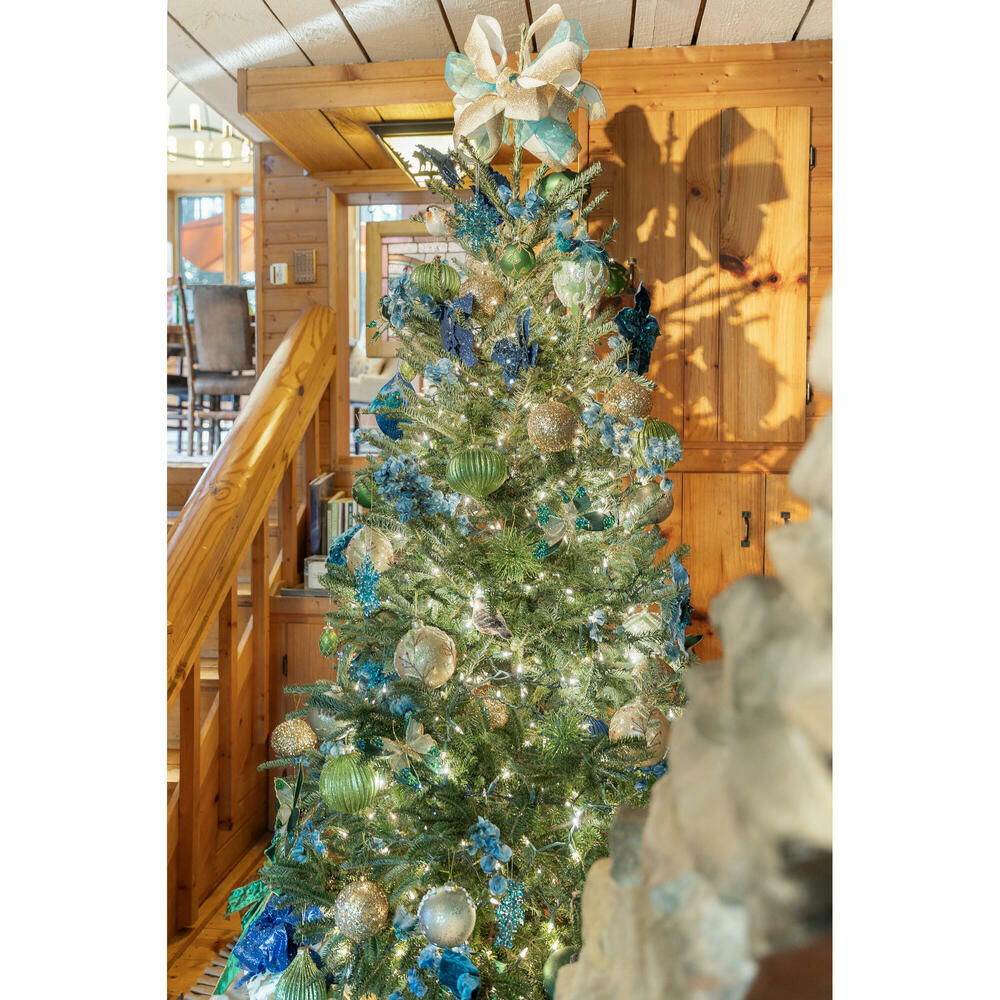This stunning tree combines the natural elegance of the Highlands with a touch of bold sophistication. Adorned with Vickerman’s dried bougainvillea and hydrangeas in deep blue, it evokes the beauty of Appalachian flowers dusted with winter frost. The vibrant blues contrast beautifully against the soft greens of the branches, creating a striking yet harmonious display. Accents of shimmering ornaments and delicate lights enhance its rustic charm, while the floral details give the tree a timeless, organic feel. Perfectly suited for its mountain setting, this tree captures the spirit of the season with a nod to nature’s artistry, blending bold textures with a tranquil color palette that feels both luxurious and grounded.