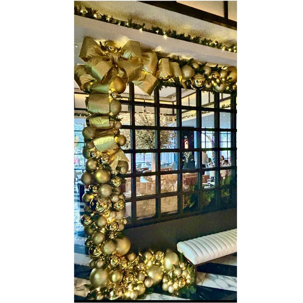 Lush golden holiday garland with monochromatic golds and an oversized gold shiny bow. Designed for Truluck’s Restaurant in Dallas Texas
