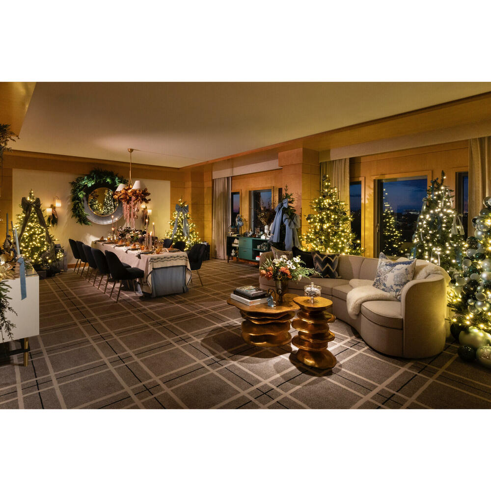 Inspired by a traditional show house, our team transformed the iconic Presidential Suite at the Mandarin Oriental, Boston blending modern elegance with the festivity of the holiday season to create a luxurious escape for the senses. Our goal was a visual experience from the moment guests arrive. We married the existing design elements, like the whimsical chinoiserie bedroom wallpaper, with our firm’s interior design style and personal aesthetic. For a calming yet festive feel we landed on a color story of blue hues and contrasted it with warm metallics. Bows in all fabrications, from velvet to silk chiffon, are a strong trend for holiday this year – which aligns perfectly with our design ethos, contemporary with timeless elegance. Photos by Michael Blanchard & Troy Wade