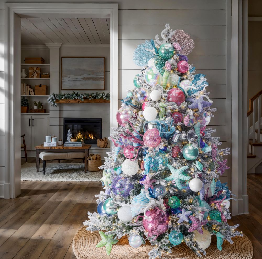 Under The Sea transforms coastal charm into an ethereal winter display. Designed for seasoned professionals, it pairs frosted, snow-dusted branches with a curated palette of turquoise, periwinkle, seafoam, pink, purple, celadon, and iridescent pearl to capture the magic of the ocean in a holiday setting. Rich in dimensional detail, this look balances oversized ornaments with textured coastal elements like glittered seahorses, starfish, conchs, coral sprays, and shell accents. Mixed finishes—matte, pearl, sequin, and shiny—create visual contrast and cohesion, while varied ornament scales and shapes ensure dynamic flow from every angle. A sculptural topper of shimmering coral fans and pastel sprays adds height and elegance. The layered composition, built with professional-grade selections, reflects Vickerman’s commitment to quality, creativity, and scale. Perfect for beachfront resorts or luxury coastal homes, Under The Sea is built to inspire—and made to impress.