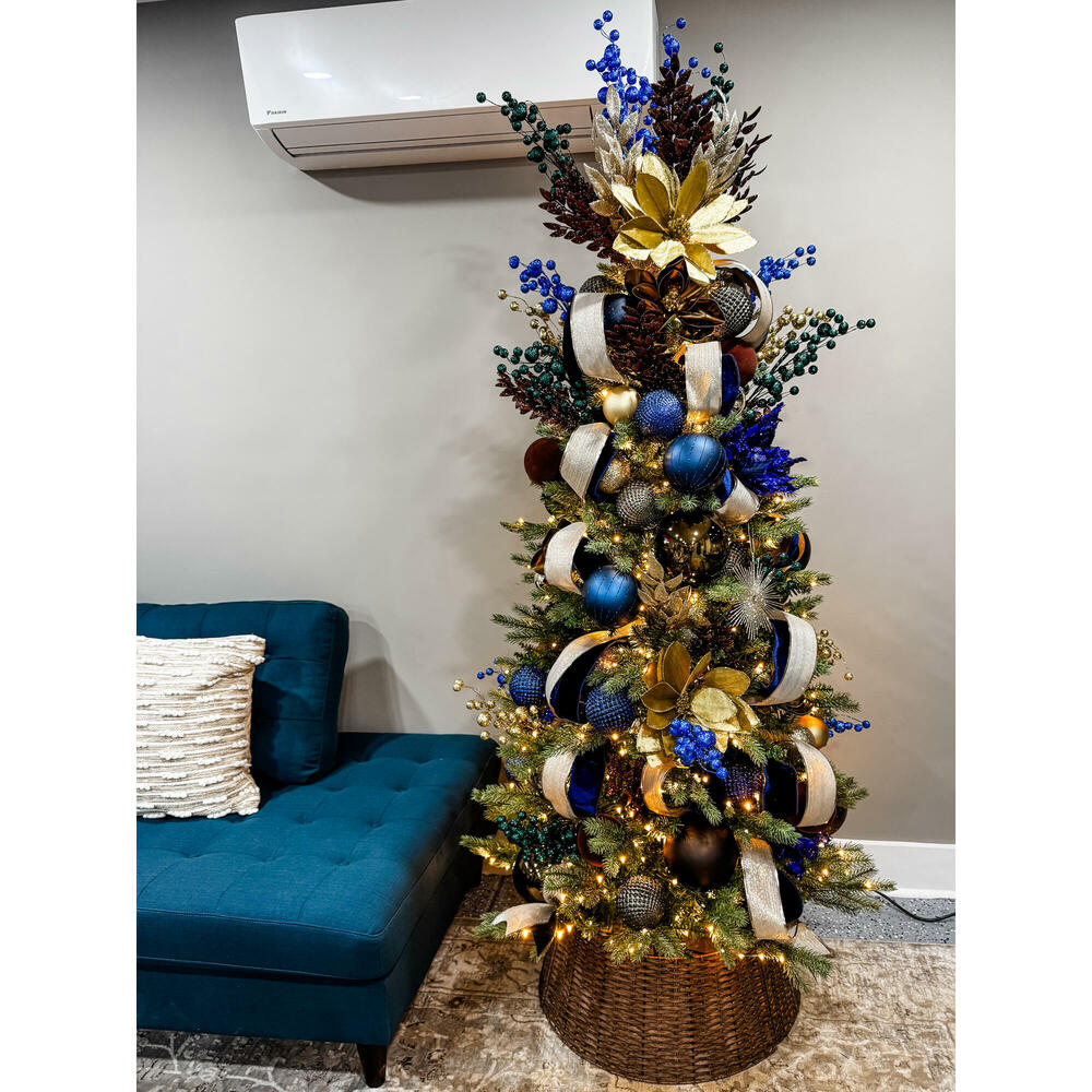 This Christmas tree is a stunning display of elegance and sophistication, featuring a luxurious palette of deep blue, gold, and bronze tones. It is adorned with oversized ornaments in rich hues, including matte and shiny finishes, that create depth and texture. Golden floral accents and metallic sprays fan out gracefully from the top, forming a radiant tree topper that draws the eye upward. The cascading ribbons in neutral tones with a subtle shimmer are expertly woven throughout the tree, adding movement and balance. Clusters of decorative berry stems in cobalt blue, teal, and bronze hues enhance the tree's layered look, while warm white lights illuminate the arrangement, creating a magical glow. The tree sits in a woven basket base, grounding the design with a cozy, natural touch, and pairs beautifully with the teal sectional couch and neutral-toned area rug beside it.