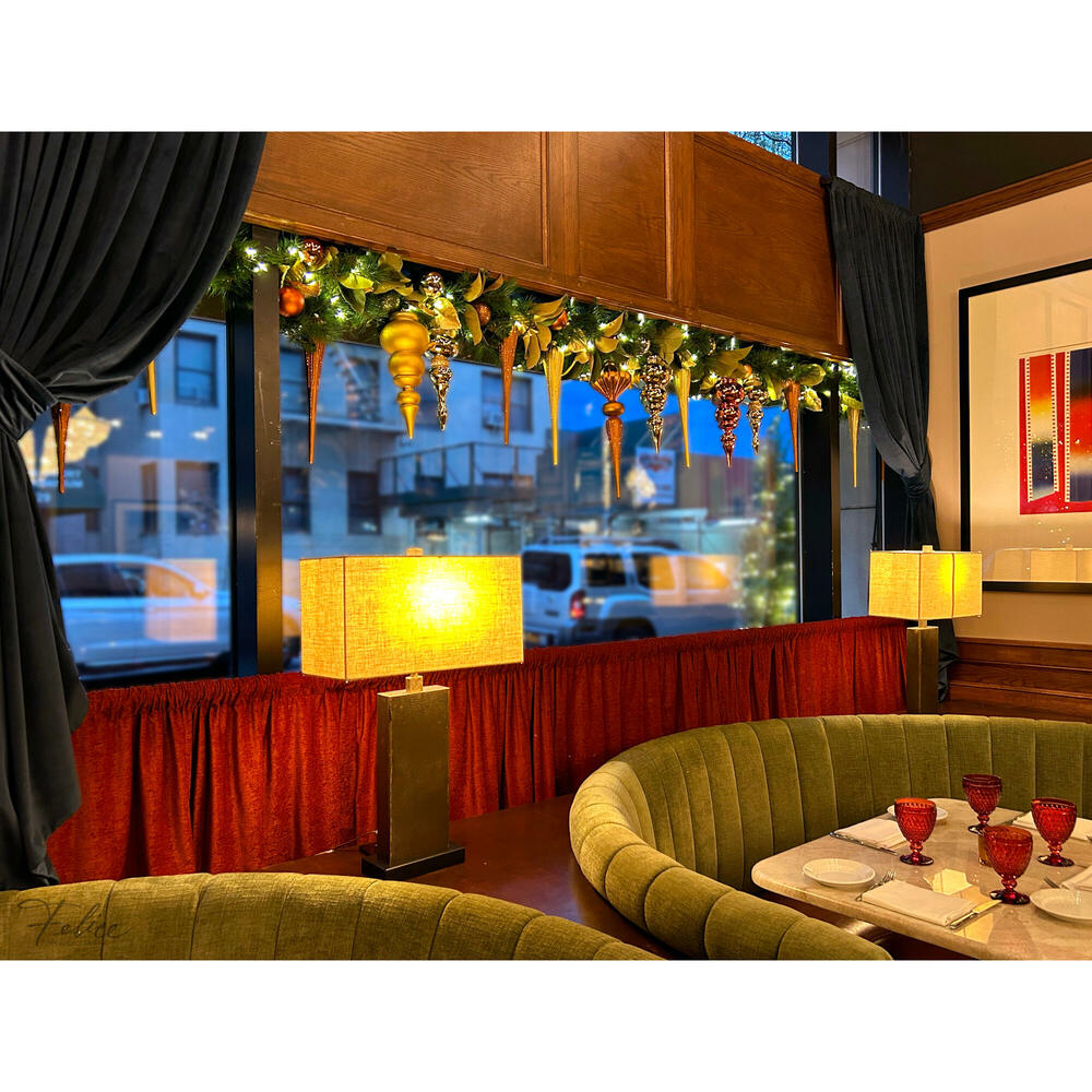 This Christmas tree is a stunning display of elegance and sophistication, featuring a luxurious palette of deep blue, gold, and bronze tones. It is adorned with oversized ornaments in rich hues, including matte and shiny finishes, that create depth and texture. Golden floral accents and metallic sprays fan out gracefully from the top, forming a radiant tree topper that draws the eye upward. The cascading ribbons in neutral tones with a subtle shimmer are expertly woven throughout the tree, adding movement and balance. Clusters of decorative berry stems in cobalt blue, teal, and bronze hues enhance the tree's layered look, while warm white lights illuminate the arrangement, creating a magical glow. The tree sits in a woven basket base, grounding the design with a cozy, natural touch, and pairs beautifully with the teal sectional couch and neutral-toned area rug beside it.