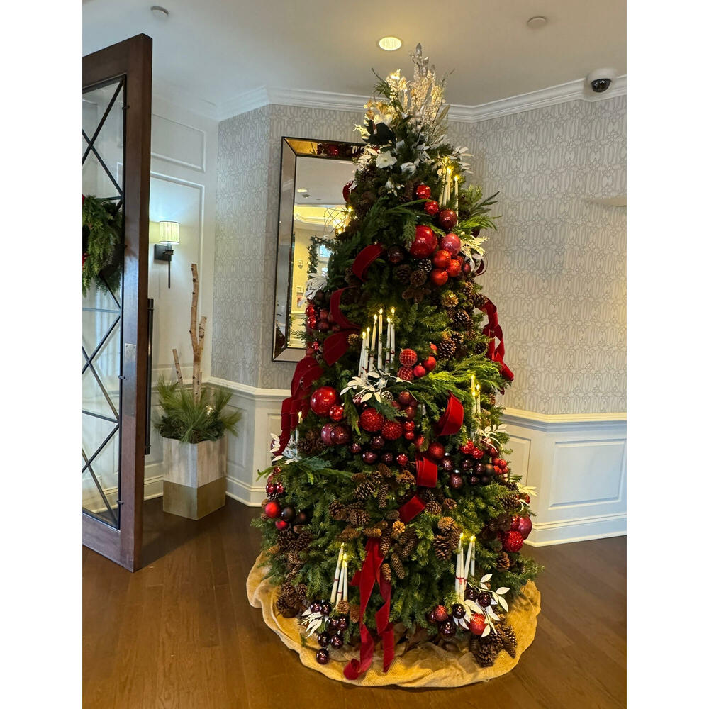 Inspired by Instagrammer @stylewithchelsea we assembled a stunning array of Vickerman balls into this gorgeous lobby holiday tree. A menagerie of red, burgundy and wine colored ornaments, ribbons and natural pinecones cascade over a lush magnolia garland at the base, nestled into a burlap skirting. Ten inch candles are clustered amongst the branches to delicately light this nine foot tree. In the background, the stair baluster is decorated with the same Vickerman wine and burgundy ornaments. In the distance, a 14" Vickerman Grand Teton garland is suspended along the column bays of the Ballroom, drawing you toward our "Winter Wonderland" in the secondary lobby beyond. Once in the Ballroom your eye shifts to the stunning mantles donned in Vickerman.