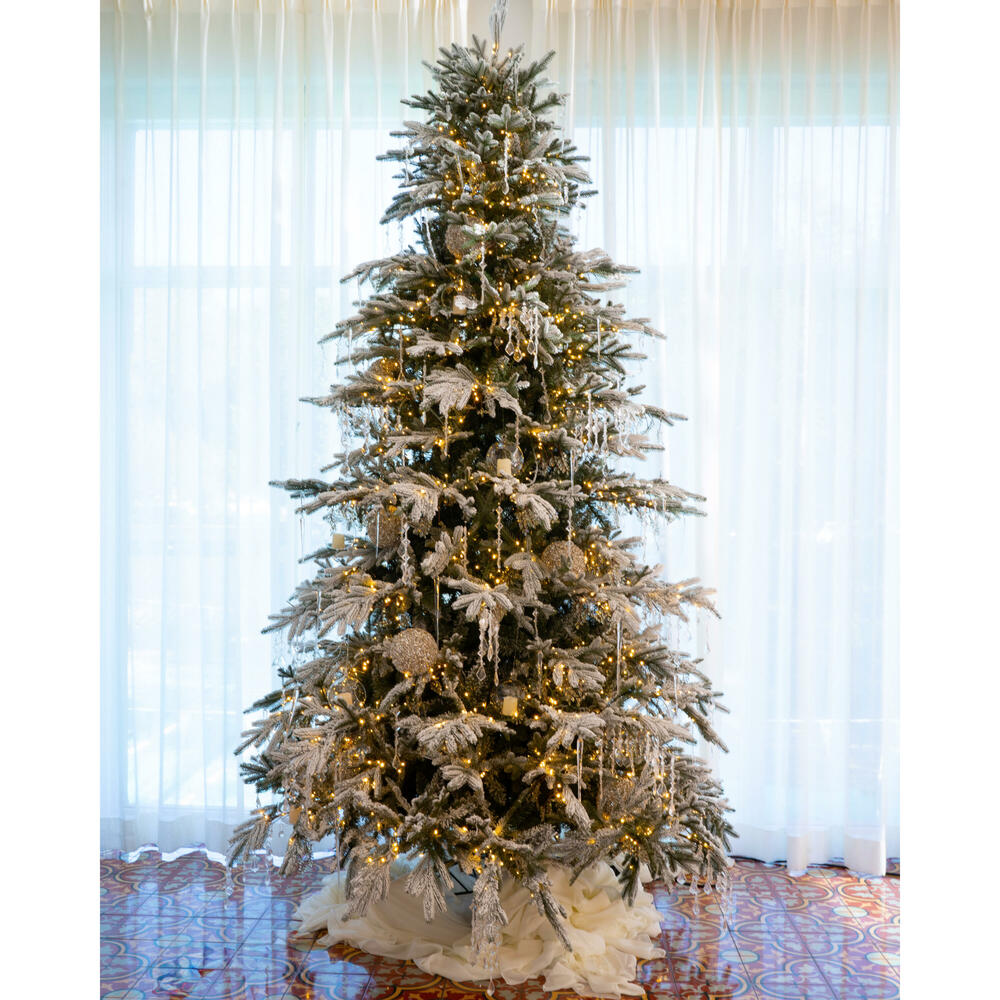 This crystal-themed room called for a crystal-themed design. We used a flocked tree and enhanced it with crystals and champagne ornaments, and added frosted teardrop swags to complement the look.