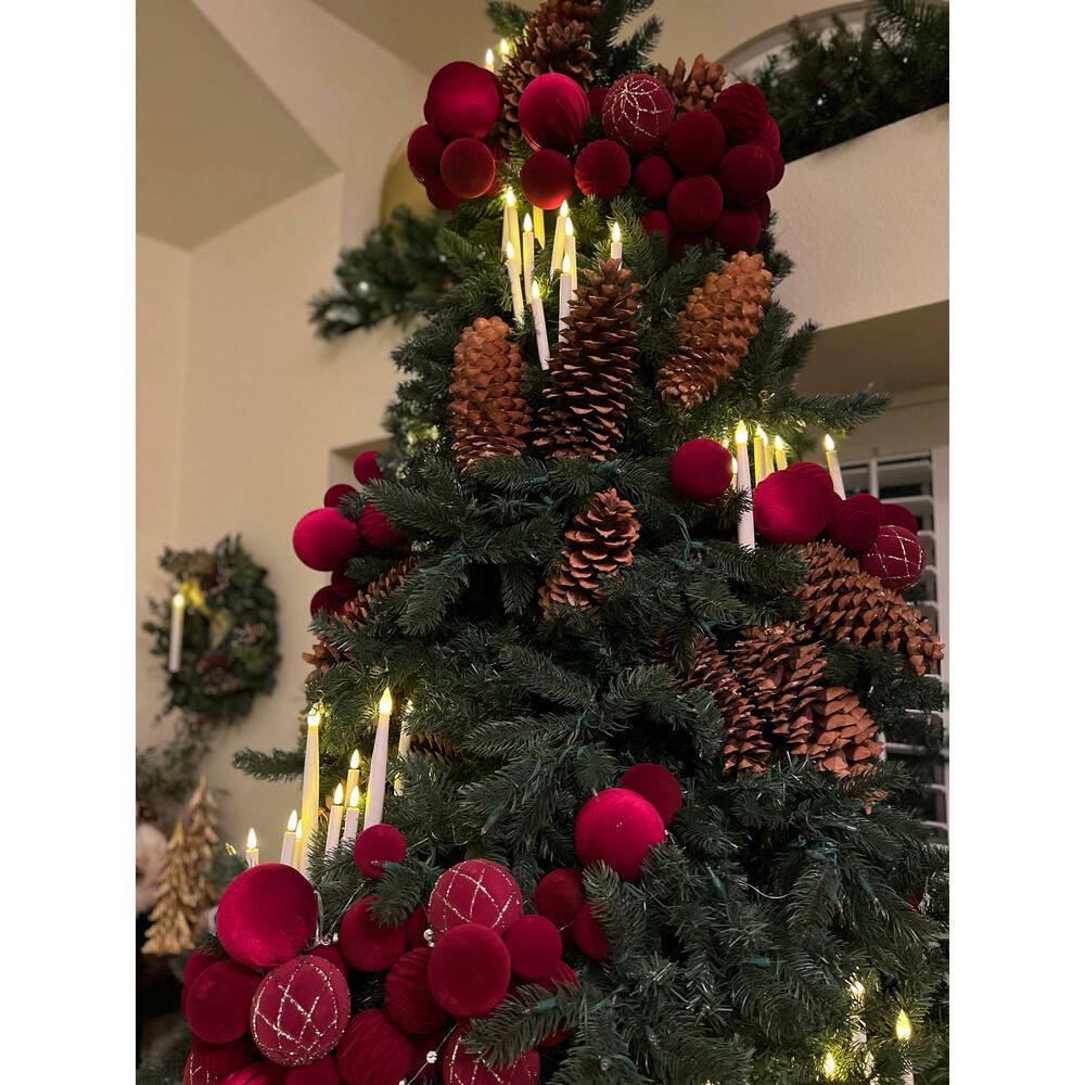 2' Acrylic boxes filled with assorted Vickerman Shatterproof in two colors. Cashmere Pine Trees wrapped with Cashmere Pine garland, pinecones, burgundy clustered balls and candles. Swagged Cashmere garland filled with Asst Picks