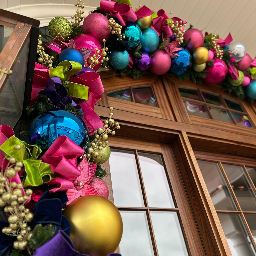 My customer wanted a fun decor for her new home. We went with bright colors of balls all sizes and bright bows