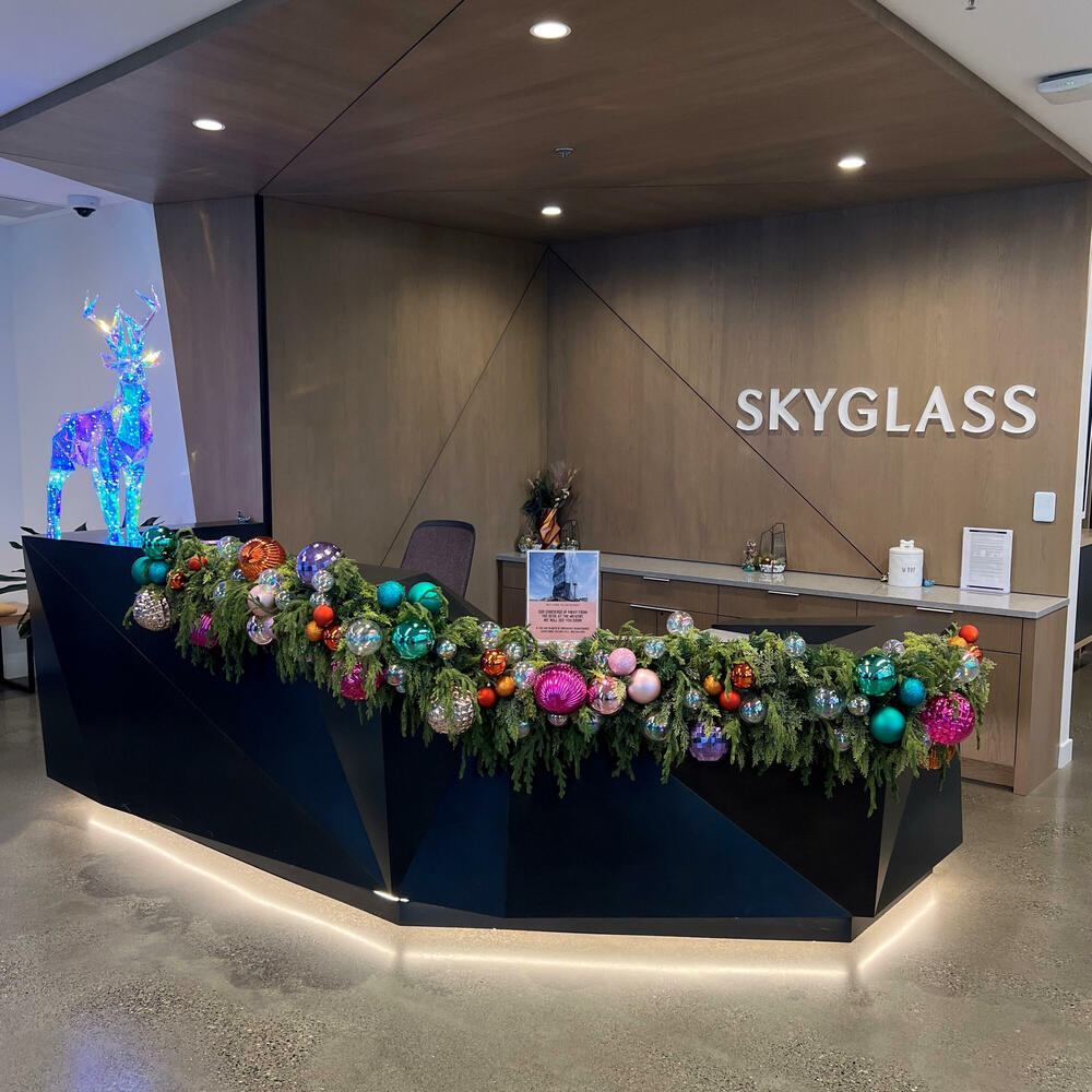 "Skyglass Apartments in Seattle's South Lake Union neighborhood seamlessly integrates unique artwork throughout its design, enhancing the living experience for residents. A central artistic theme at Skyglass is the lore crafted in collaboration with the local design group House of Sorcery. This narrative revolves around three 'guardians,' depicted in murals on each parking level, serving as wayfinders within the building. These guardians are envisioned to have discovered and repurposed gemstones into various art pieces displayed throughout the property. The story culminates in a stained glass-style window wall in the Celestial Lounge, purportedly crafted from the gemstones found at the lower levels, adding a mythical dimension to the resident experience. Drawing inspiration from Skyglass’s colorful lobby mural and the iridescent elements woven throughout the building, I envisioned a holiday tree and garland that truly POP with vibrant colors. Reflecting the building's artistic flair, the décor incorporates bold, shimmering tones and multidimensional details to complement the property’s dynamic and creative spirit, making it a festive centerpiece that resonates with Skyglass's unique aesthetic."