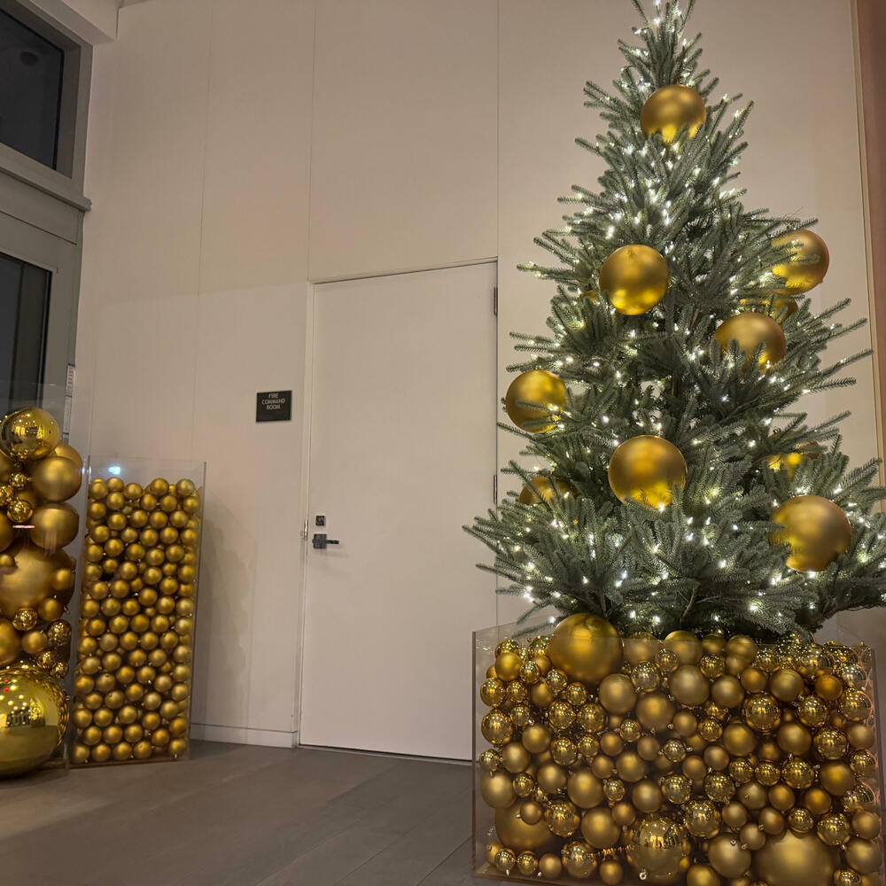 The Marea Lobby - This luxury condominium building commanded a more minimal / transitional approach to holiday decoration. Thinking outside the traditional box, Angela created an unexpected and playful interpretation to surprise and delight the discerning south beach residents. Angela custom fabricated large acrylic vessels to house an illuminated tree and hundreds of matte/shiny Christmas ornaments in various sizes