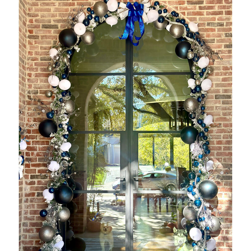 Decorated clients home for their company holiday party incorporating the company color scheme. Used a mix of Vickerman products featuring flocked Alaskan garlands, midnight blue pearl ball garlands, pewter coin sprays with assorted large ornaments and ribbon.