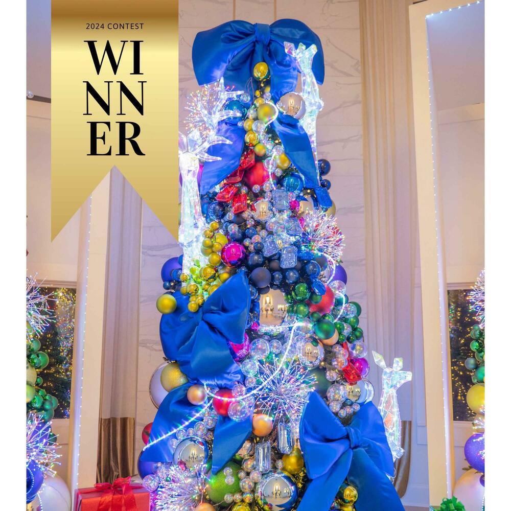 This bold and futuristic holiday design showcases a stunning use of bright, bold ornaments arranged in grouped clusters and striking color blocks, enhanced with metallic and iridescent tones, jewels, and LED lights. The concept envisions a modern take on Christmas, featuring thousands of Vickerman ornaments in various shapes, sizes, and styles. Custom 14-foot tree display boxes, accented with LED lighting, serve as the centerpiece, complemented by an array of iridescent LED holiday figurines. From the over-the-top entry display to the jaw-dropping triple-tree arrangement in the main family room, every detail of this design exudes extravagance and innovation, leaving guests in awe at every turn.