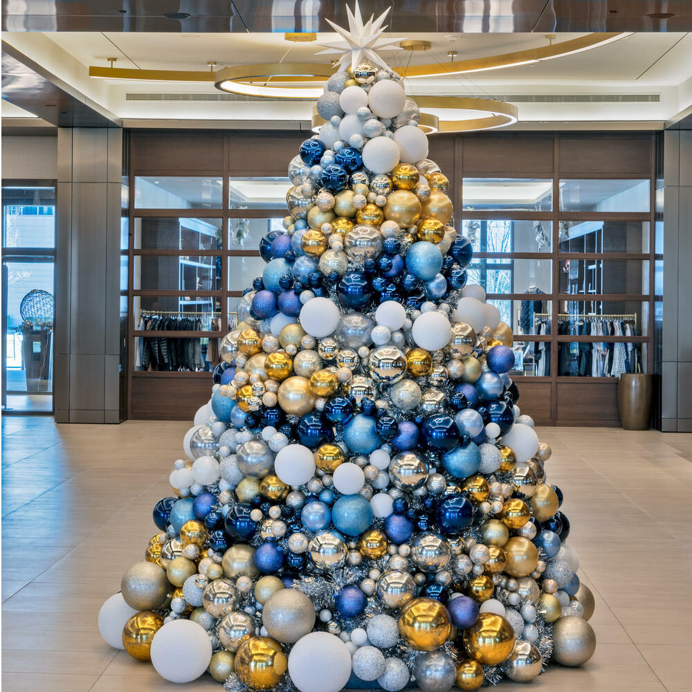 As part of our modern redesign of Christmas at the Omni Star Hotel, we created a unique and contemporary Ball Tree that cascades in the property's signature colors. Standing 11 feet tall with an 80-inch base, the tree is adorned entirely with ornaments from Vickerman. We developed this unique concept first with hand drawings and brought the vision to fruition. Additionally, we crafted a whimsical outdoor design for two key areas of the pool deck, which overlooks the Dallas Cowboys' Championship Plaza. This included illuminated stars and custom-designed bases featuring large ornament balls in Midnight Blue and Shiny Silver, available in 12", 15.75", and 20" sizes all from Vickerman's. In the lobby, we introduced a new entry tree with an updated color palette, predominantly using Vickerman ornaments and coordinating base decorations.