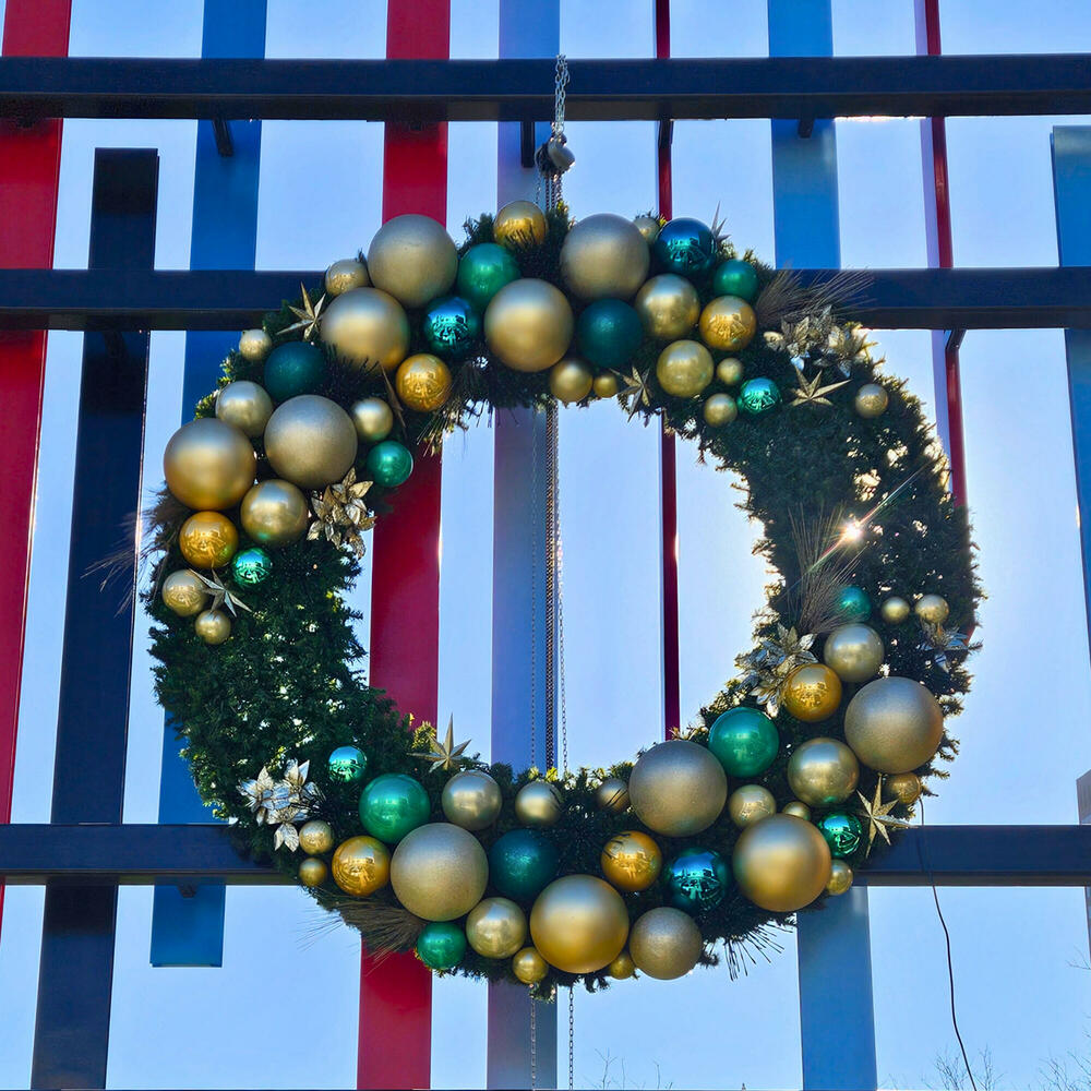 Shades of teal, gold, and champagne come together on a 12' contemporary wreath. Interspersed with metallic sprays and floral elements, the design exudes a balance of grandeur and festive elegance, perfectly framed against the modern architectural backdrop.