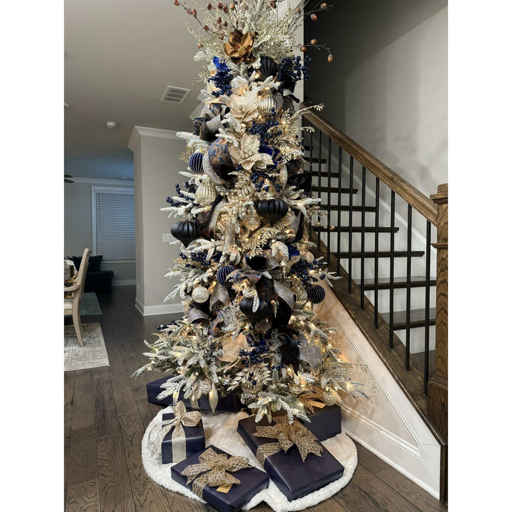 "Dive into a celestial wonderland with my Starlit Splendor tree, where elegance meets enchantment. Adorned with rich navy blue and champagne hues, this tree exudes a regal charm that’s both timeless and sophisticated. The deep navy ornaments and florals evoke the tranquil beauty of a midnight sky, while the sparkling champagne accents mimic twinkling stars, casting a radiant glow. A delicate sprinkle of silver, copper, and gold elements adds a touch of magic, creating an ethereal aura. The tree is crowned with a shimmering topper of florals, celebrating the pinnacle of holiday joy and wonder. Each ornament has been meticulously selected to contribute to the tree's harmonious balance, from glossy baubles to elegant ribbons and sparkling floral clusters. The gentle interplay of colors and lights brings to life a sense of serene opulence, making it a true centerpiece of holiday celebration. Next to the tree is the Midnight Reflections mirror which extends the theme throughout the space, reflecting the elegant navy and champagne decorations of the tree, much like a clear night sky reflecting the twinkling stars."