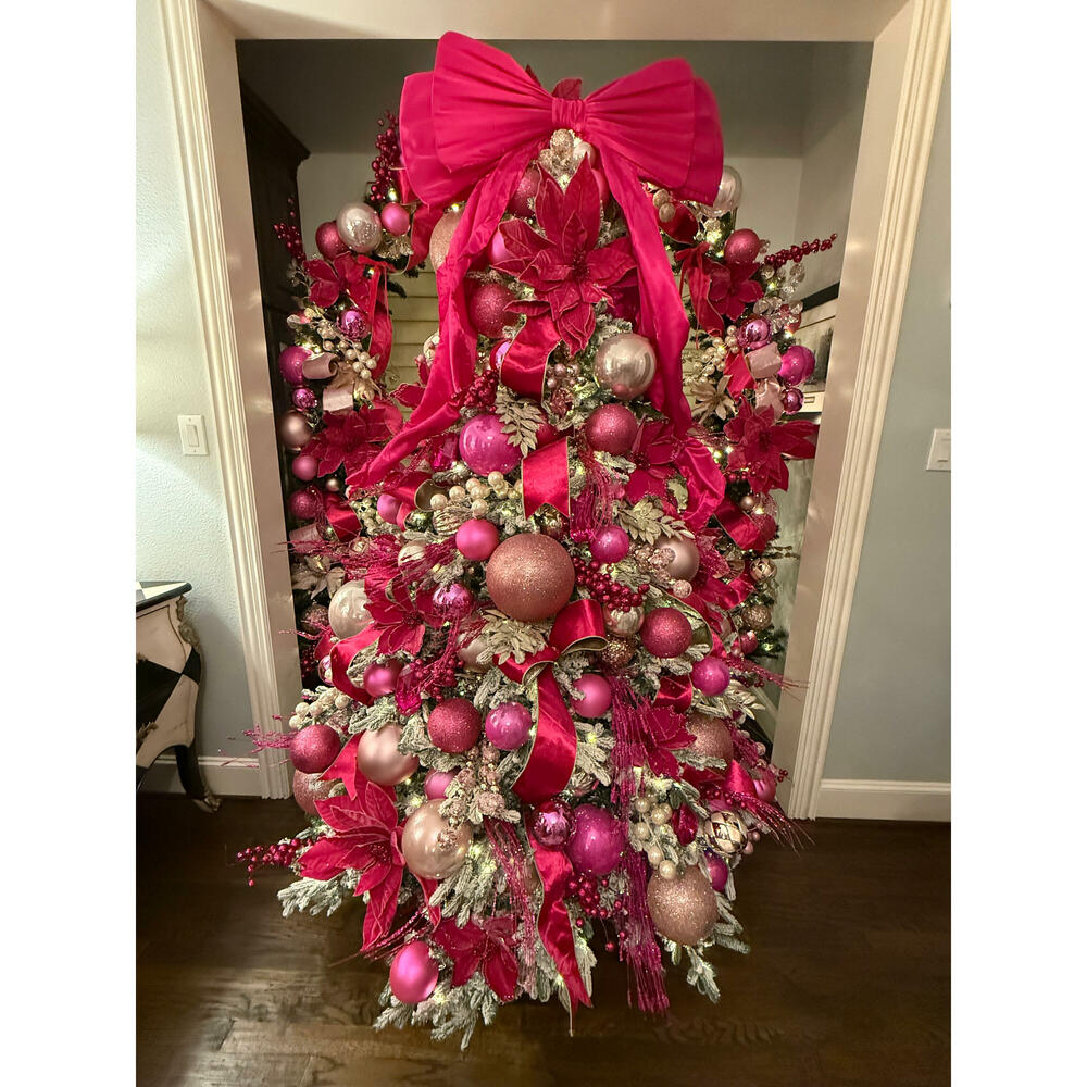 Created for my personal home in a lounge area. I was inspired by my favorite color, pink. Adorned with shades of hot pink and rose gold all tied together with notes of white pearl and champagne this glamorous pink tree is an eye catcher. Topped with a giant beautiful pink bow and stunning 6 foot arch behind to match, this design is one of a kind!