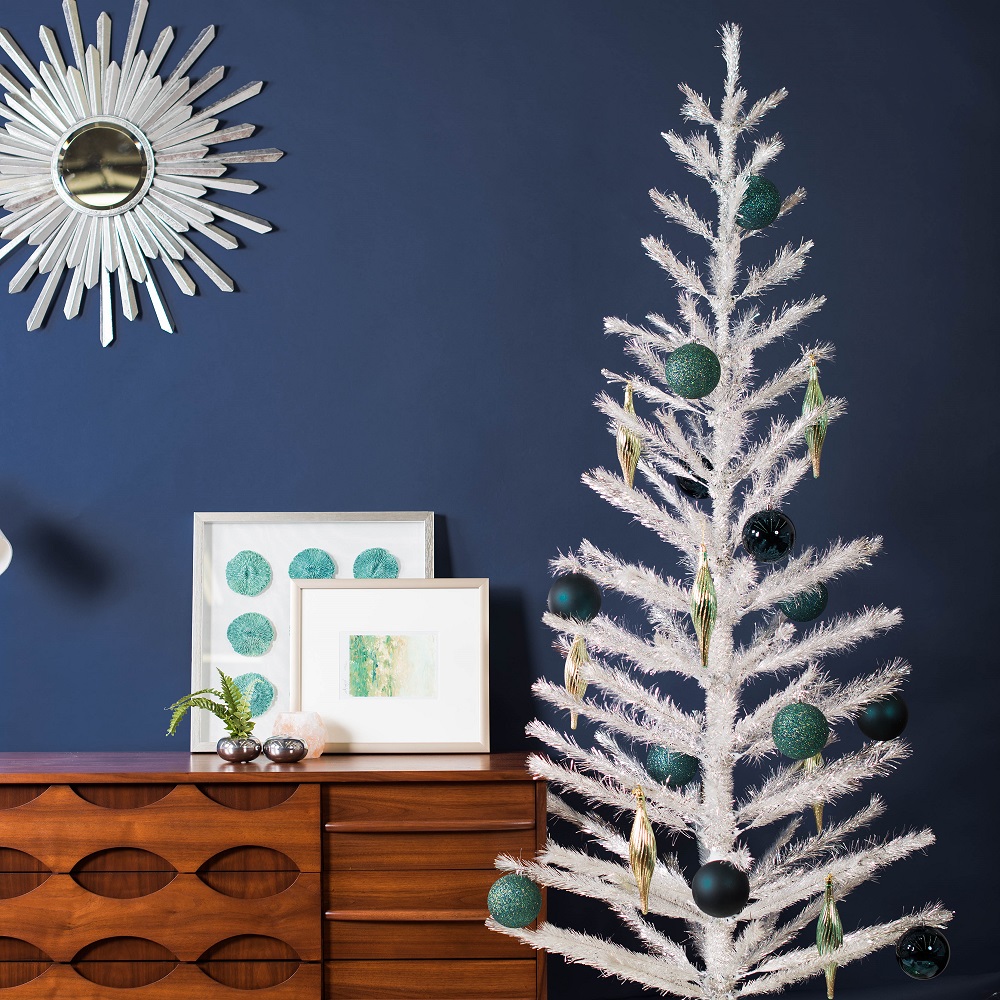 Vickerman's feather tree offers a simple clean look that works well with the Mid-20th century modern design.