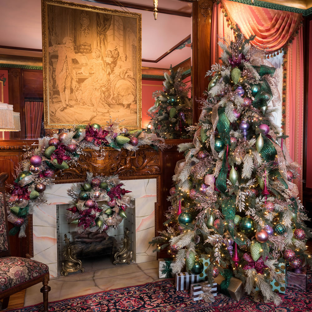The Van Dusen Pink look incorporates muted pinks and greens for a interesting twist on holiday decor.