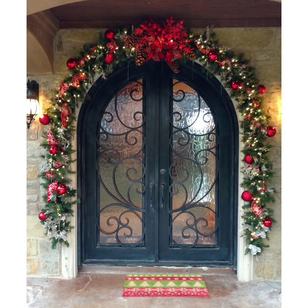 The Watson's of Fredericksburg arch is decorated with various red ornaments, ribbon, and silver accents.
