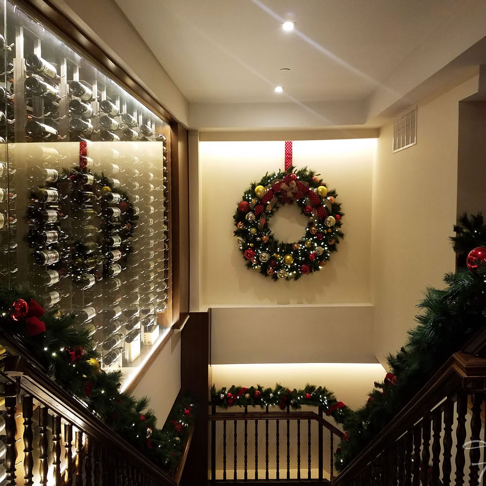 Classic holiday red and gold shine bright at Benjamin Steak House in New York City. Visual interest is heightened by mixing ornaments of varying textures and tones. The use of wine color ornaments provides additional depth and picks up the beautiful red diamond jacquard ribbon used throughout the space.