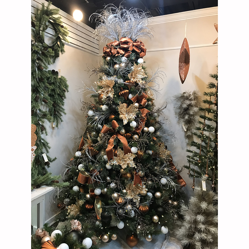This lucious green tree is covered in a metal mix color pallete that includes pewter, copper, cafe latte, and white. The mixture of dark and light colors creates a contrast that catches anyone's attention. This tree is covered with glitter sprays that makes the tree stand out from others.