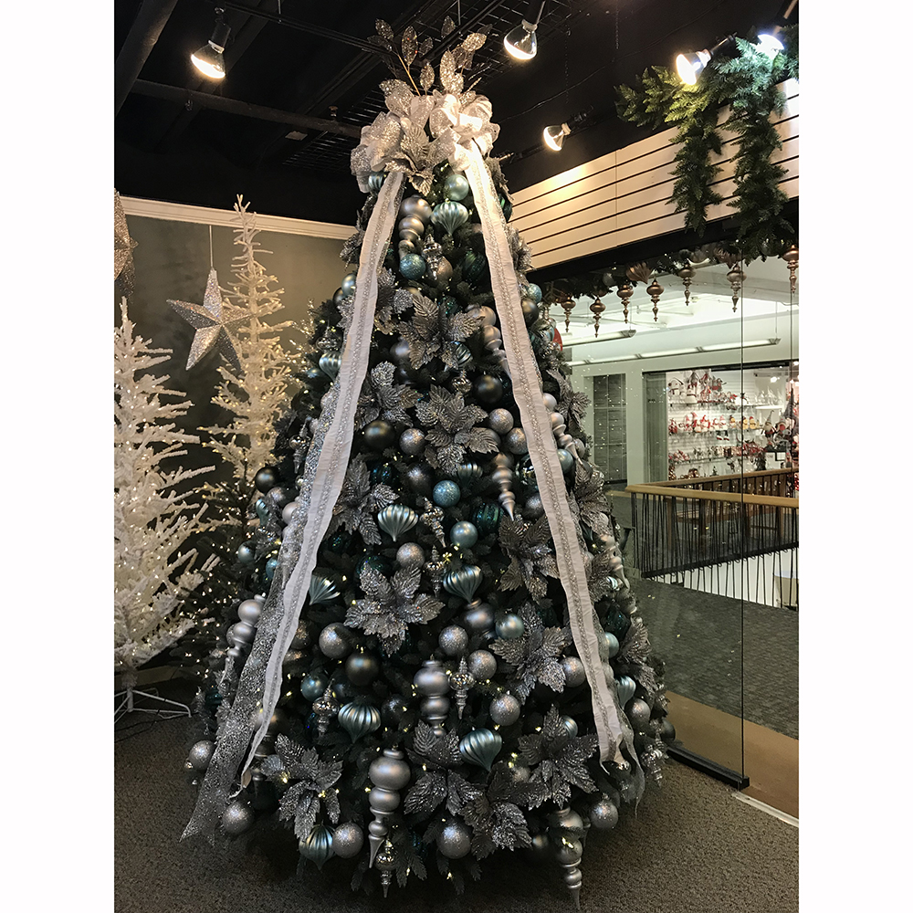 This cool color palette includes grays and baby blues on a Colorado Blue Spruce tree. This tree would tie in nicely with modern decor. This look includes a variety of shapes and sizes of ornaments. This tree features a ribbon crown and glitter sprays sprouting from the top.