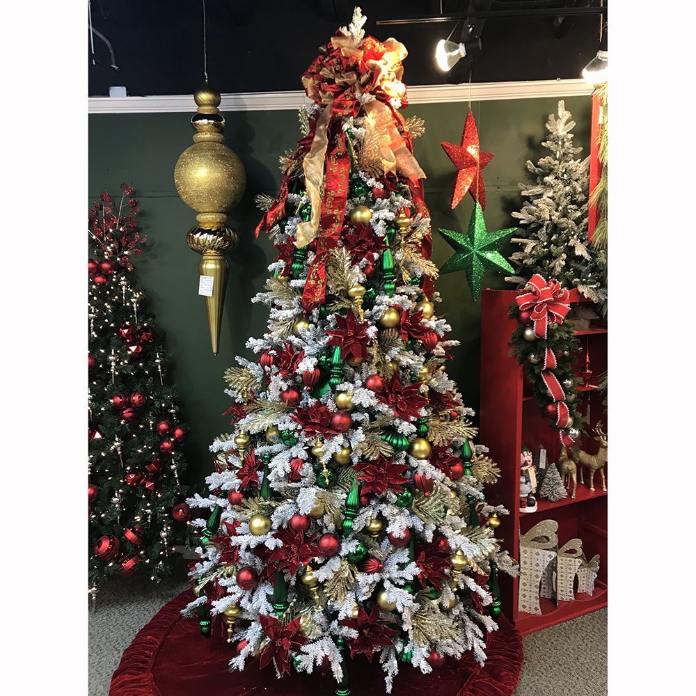 This classic color palette is given a fresh look on a lightly flocked tree. Reds, greens, and golds mix together for the perfect holiday feel. The top of the tree is crowned with a rich bow that ties the look together.