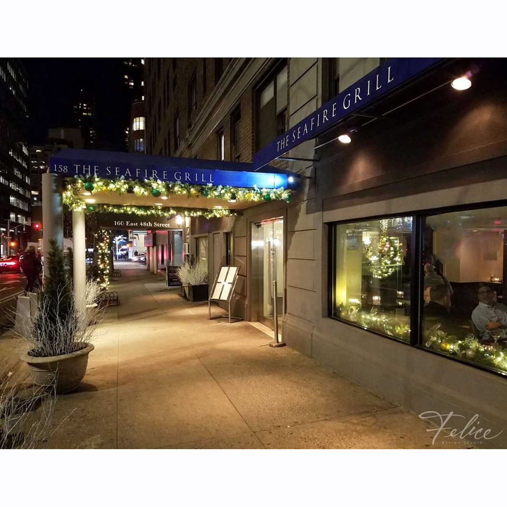 The design is inspired by the colors and textures found at the coast. The light and organic coral textures compliment the sea foam and sea blue diamond bauble ornaments. All of these elements are brought together on frosted garlands and wreaths found both inside and outside the restaurant.