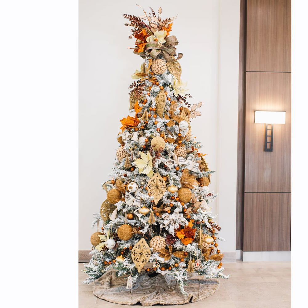 Inspired by a walk through a winter woodland, this flocked tree is decorated with wood and rope orbs, birc-patterned ribbon, paper trees and other accents in soft wood tones with touches of copper for warmth.