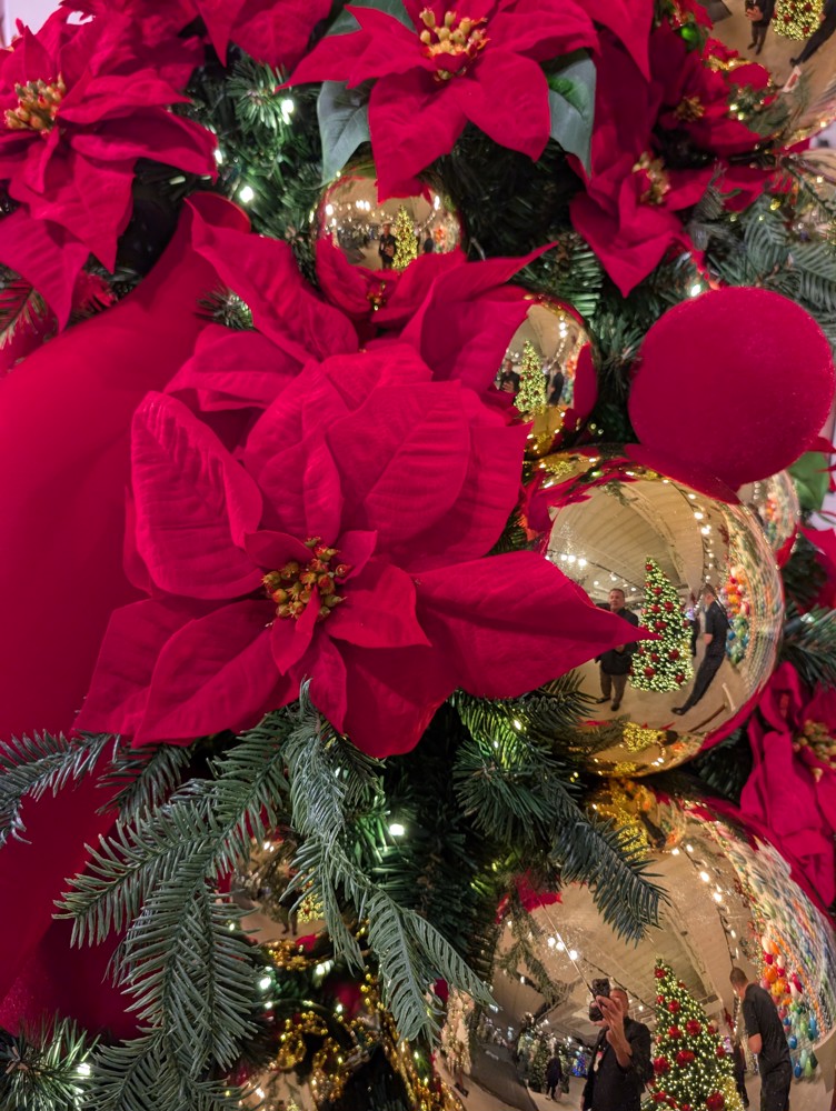 Warm, welcoming, and timeless, the Comfort & Joy Christmas Tree captures the heart of traditional holiday decorating. Lush green branches are layered with vibrant red poinsettias, rich velvet accents, and radiant gold ornaments that bring depth, warmth, and classic elegance to the design. Oversized reflective gold balls anchor the tree visually, adding drama and a sense of abundance, while the red tree skirt completes the look with cozy sophistication. Designed to evoke cherished holiday memories and a feeling of togetherness, this tree blends classic color, luxurious texture, and festive charm. On display in the Vickerman Showroom, Comfort & Joy is a beautiful celebration of the season—inviting, joyful, and unmistakably Christmas.