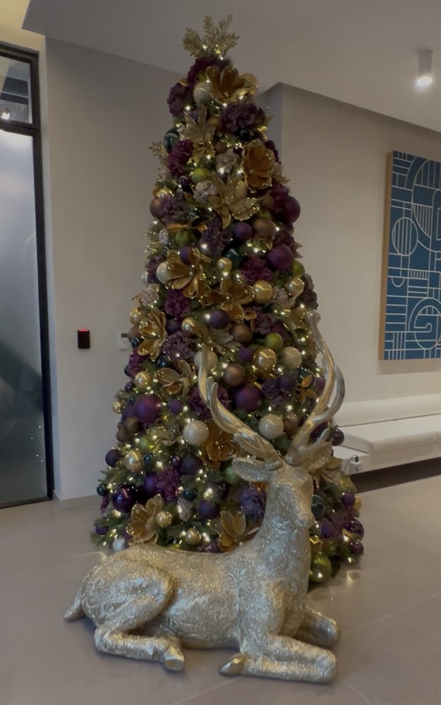 This statement Christmas tree is the definition of elevated holiday luxury. Designed in a rich jewel-tone palette, it layers deep plum, aubergine, olive, champagne, and soft gold for a look that feels both dramatic and refined. Oversized matte and satin ornaments are woven seamlessly with metallic florals, gilded foliage, and warm twinkle lights, creating depth, texture, and a luminous glow from every angle. Anchored by an elegant gold reindeer sculpture, the tree tells a story of modern opulence with a whimsical edge—perfect for upscale residential spaces, boutique hotels, luxury lobbies, or brands looking to make an unforgettable seasonal impression. It’s bold without being overpowering, festive without being traditional, and designed to stop people in their tracks.