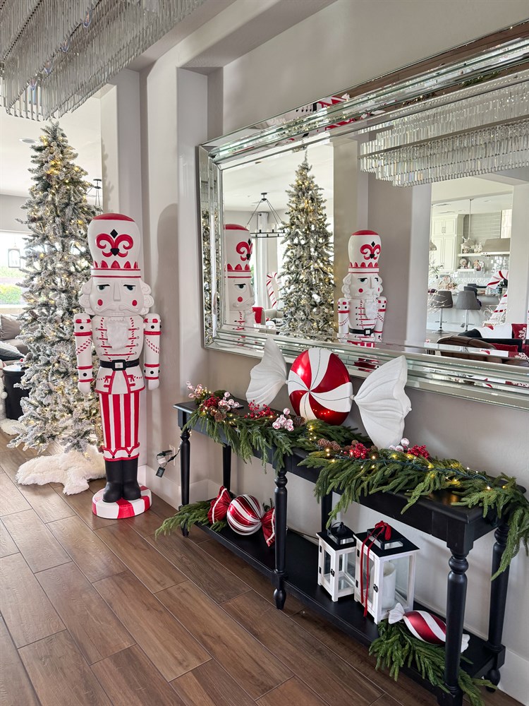 Welcome to my festive Peppermint Christmas entryway, full of cheer! The giant peppermint steals the show, adding a bold pop of red-and-white magic that makes the room feel like a holiday candy wonderland. Paired with cozy greenery, twinkle lights, and classic nutcrackers, it brings the perfect mix of whimsy and charm. The entryway sets the tone for the rest of your home, and mine this year set the stage for a fun, playful, and magical holiday. (I had to upload a low quality image because the original was too large to upload. Pls let me know if I can email you the high quality image thanks)