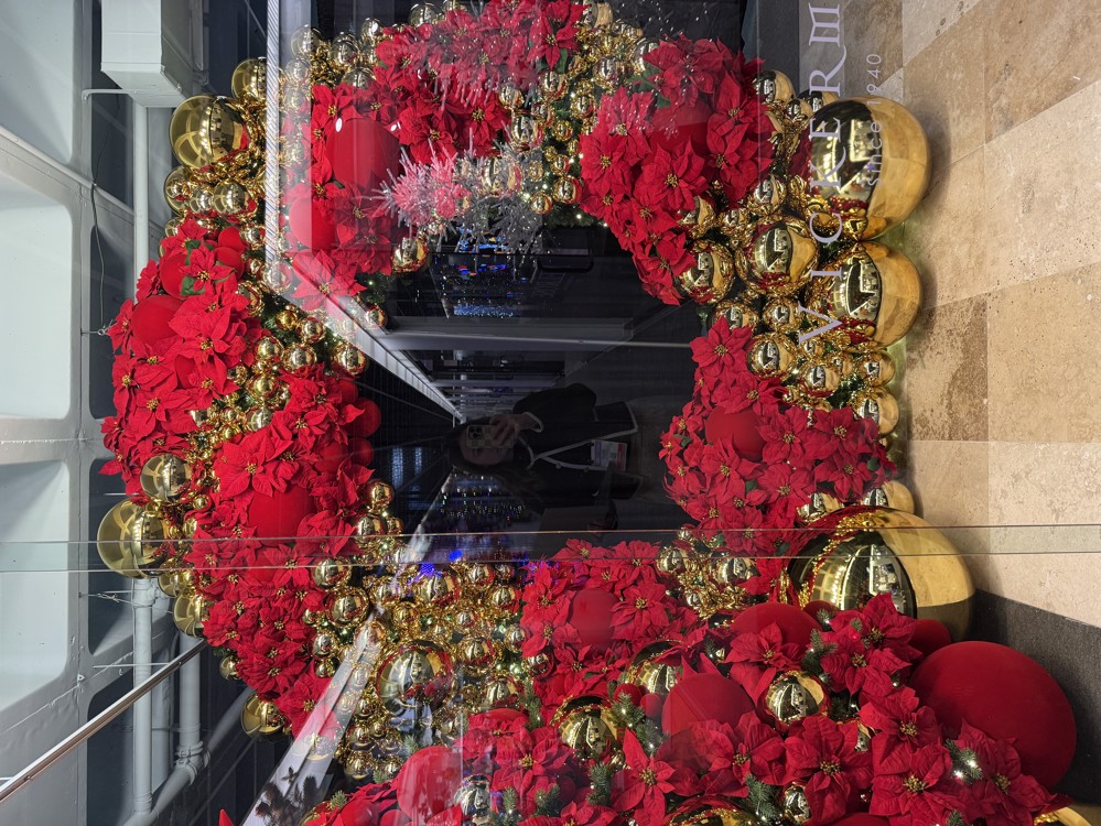 Designed as a festive focal point in the Atlanta Showroom, the Atlanta Photo Op Wreath brings the timeless charm of the Comfort & Joy collection to life in one striking statement. Rich red flocked ornaments, gleaming gold shiny accents, and classic red poinsettias are layered to create a lush, dimensional design that feels warm, joyful, and unmistakably traditional. Created as an interactive backdrop, this oversized wreath invites guests to step in, capture the moment, and experience the welcoming spirit of the season through a cohesive and classic holiday palette.