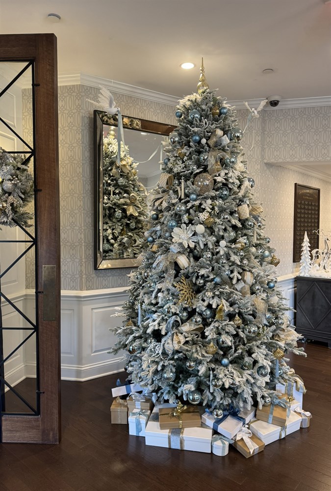The highlight of the entry way for a seaside country club, this tree's design is inspired by the club's logo, a bird in flight over a serene blue sea. Vickerman's ornaments provided the perfect palette with stunning magnolia accents. Beautiful 9" and 11" feathered doves help dress the tree with velvet ribbons.