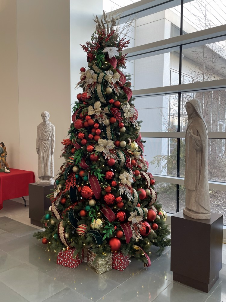 Standing tall at twelve ft., this magnificent tree enhances the entrance with a very traditional elegance. The tree is embellished with the most Royal Ribbon. A classic green velvet ribbon edged with a golden trim, a lovely red ribbon with a joyful holiday message, “Merry Christmas.” Adding charm, emerald velvet ribbons with light gold sequins and accented with the wine velvet colored ribbon. Complimented with shatterproof ornaments in green, gold, red – a variety of sizes for the grandness of the tree. The greatest effect was the 6” branch ball garland (N2401) that cascades across the tree. At the peak of the tree, an assortment of festive picks, finished off with 12” red 3D glister star – shining brightly on every angel of the royal tree.
